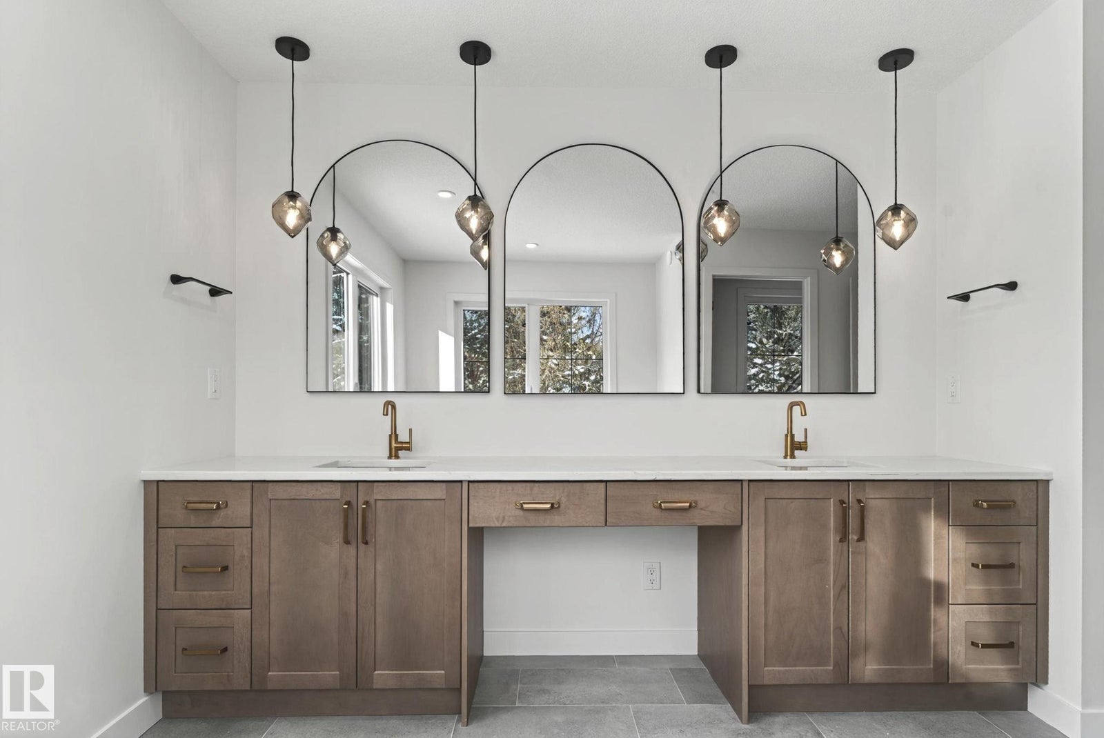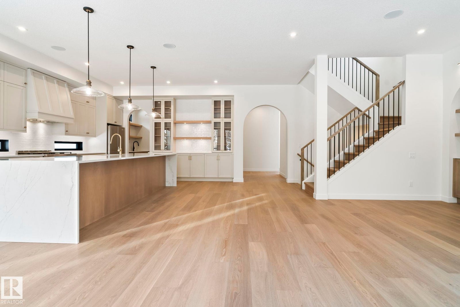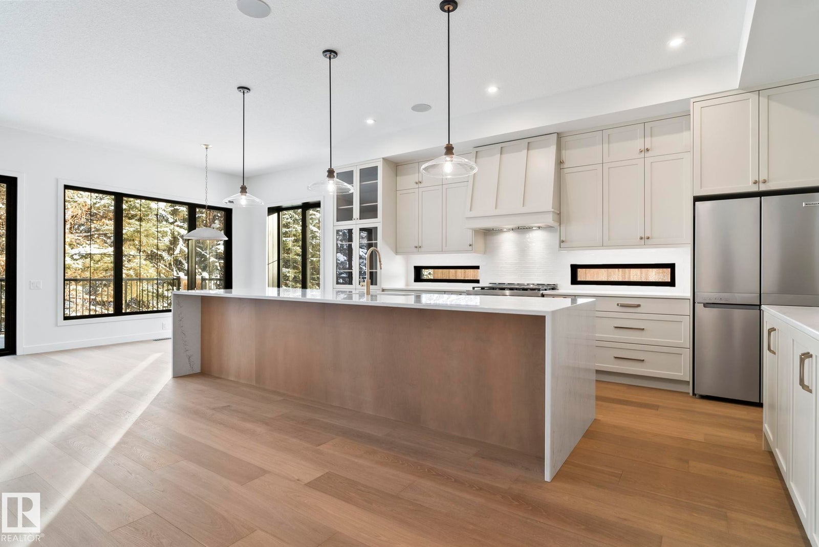Stunning Riverside estate lot backing onto a natural storm pond with Big Lake views and sought-after southwest exposure. This architecturally refined home features 10’ main floor ceilings, 8’ doors, and a full Hardie Board exterior with cedar accents. The open-concept interior offers shaker cabinetry throughout, 9’ kitchen cabinets with crown moulding, glass hutch cabinetry, quartz backsplash, upgraded hood fan, and premium KitchenAid appliances. Additional highlights include silgranit sinks with elegant gold fixtures, stained railings, upgraded lighting, a glass-enclosed den, and a striking plaster fireplace. The spa-inspired primary ensuite includes custom mirrors, gold plumbing, tiled niche, and upgraded tilework. Enjoy tranquil evenings on the covered deck overlooking water and nature with uninterrupted pond views. Ideally located steps from Lois Hole Provincial Park, scenic trails, downtown St. Albert, and convenient Anthony Henday access. All images shown are artist renderings and/or a show suite.